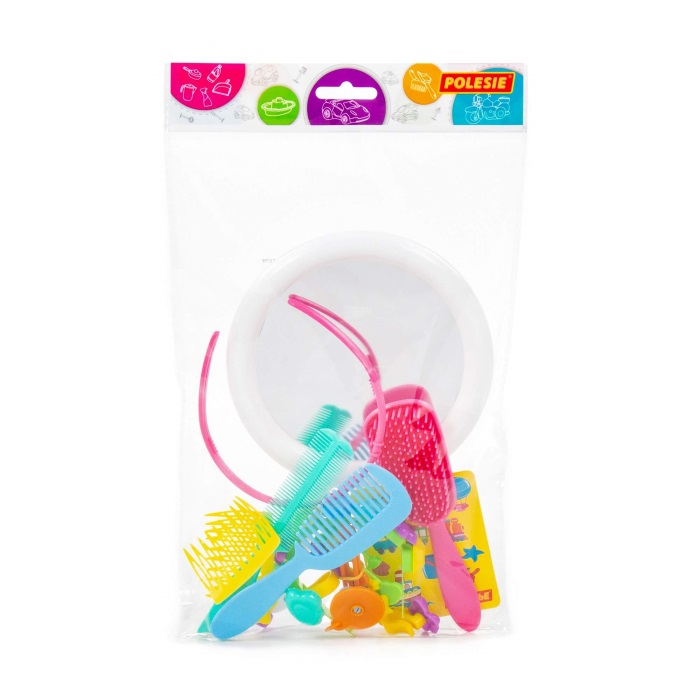 Набор детских украшений и парикмахерских принадлежностей для маленьких красавиц от 3 лет. В набор входят: расчески - 3 шт., обруч для волос - 1 шт., гребешки - 2 шт., основа для браслета – 1 шт., основа для кольца – 1 шт., основа для клипс – 2 шт., основа для кулона – 1 шт., элементы для украшения – 19 шт., зеркало - 1 шт.